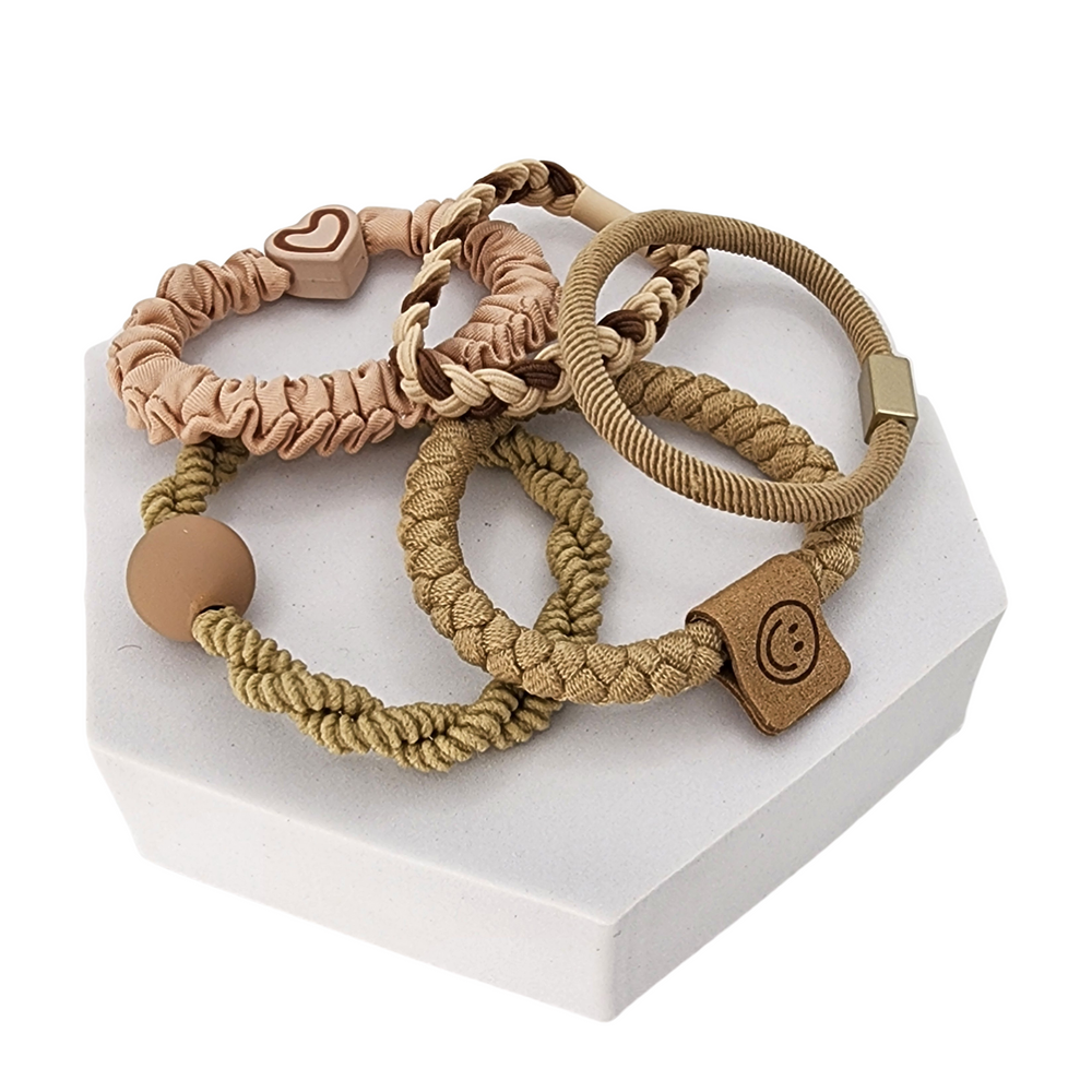 Each piece is finished in soft neutral beige with charming heart and bead details—easy to match, easy to love. The smooth, no-snag braid helps reduce tangles and breakage, while the gentle stretch grips without creating harsh creases. Wear one for everyday errands or stack a few for a stronger hold (and a little arm-candy moment).