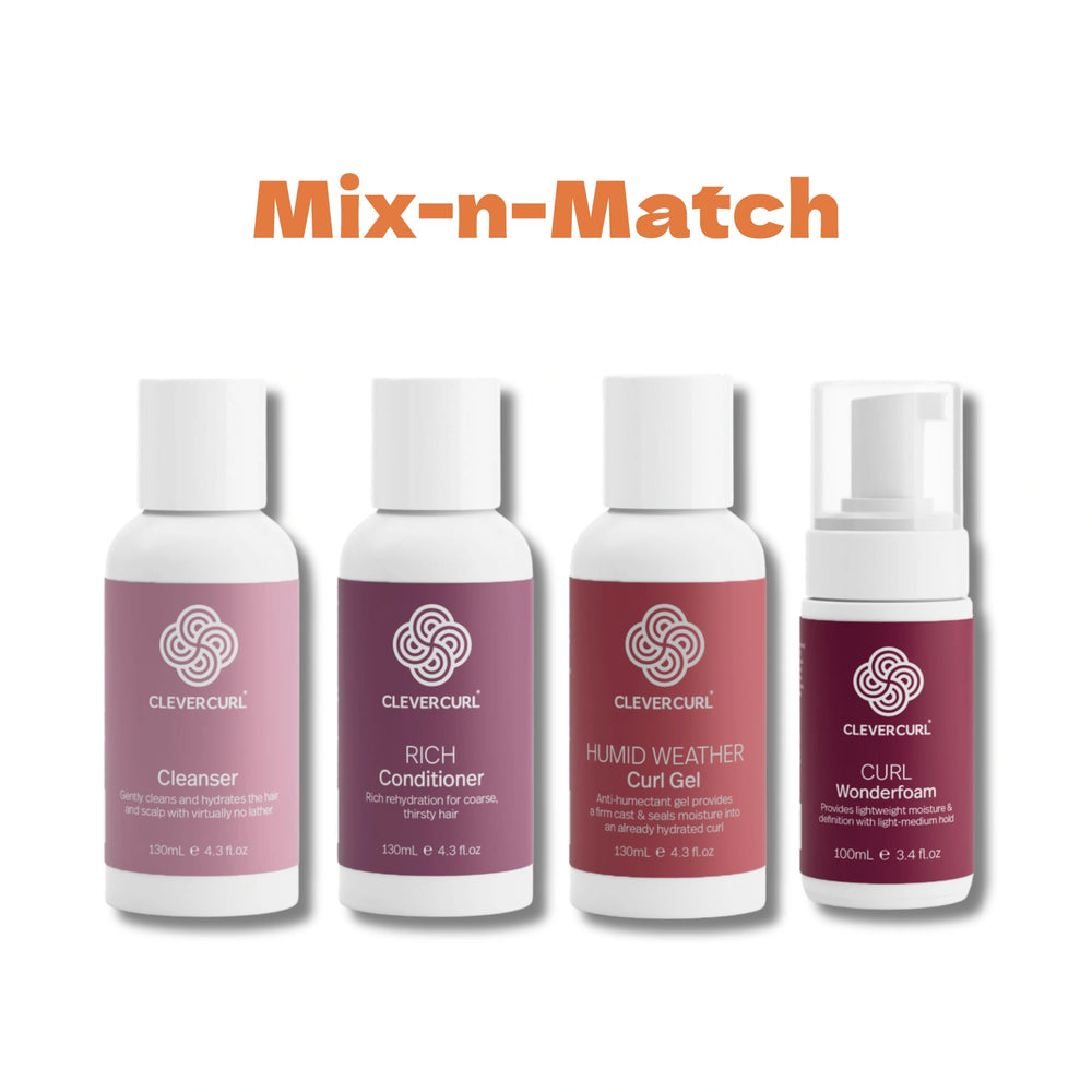 Dryer, high-density curl types is best conditioned with Rich conditioner while Light is better for finer curls. Humid Weather Clever Gel contains anti-humectant properties which locks moisture into an already hydrated curl. Dry Weather Clever Gel contains humectant properties which attracts moisture from the air into the curl – perfect for hair requiring extra hydration